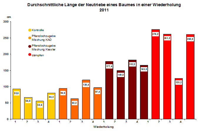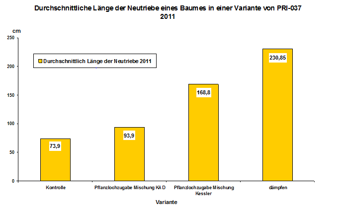 Yves Kessler Vegetationstechnik | Lösungen | Bodenmüdigkeit Lösung bei Bodenmüdigkeit durch den Einsatz von GreenFit KoBa Im Rahmen eines Versuches beim DLR Rheinpfalz, der früheren Forschungsanstalt für Weinbau und Gartenbau, wurde letztes Jahr nach neuen Maßnahmen und Möglichkeiten gesucht, um die Bodenmüdigkeit zu bekämpfen. Hierbei wurde - neben anderen Produkten - auch GreenFit KoBa eingesetzt. GreenFit KoBa hat unter den eingesetzten Produktvarianten zum besten Triebzuwachs an den Versuchsbäumen Die Variante mit GreenFit KoBa erzielte, als bestes Produkt im Versuch, einen Zuwachs von durchschnittlich 168,8 cm! |